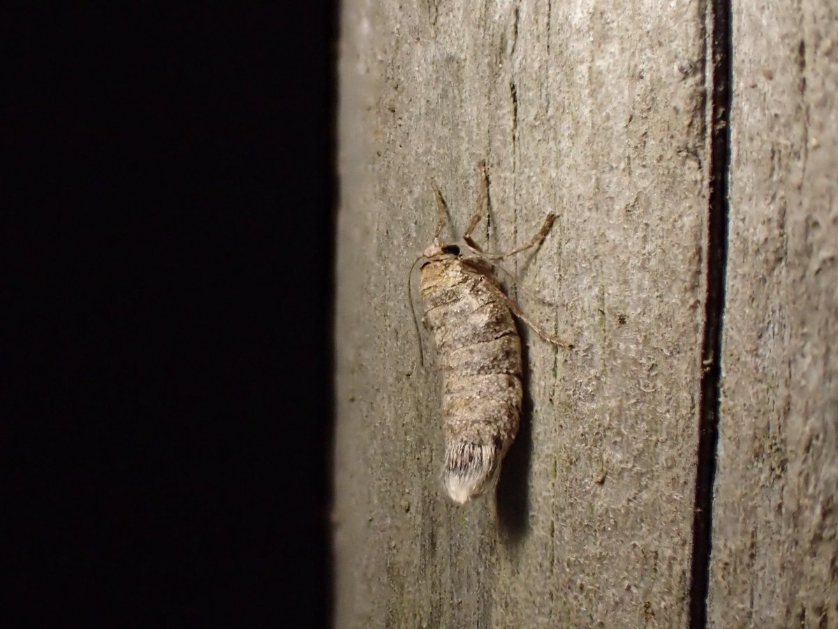 それが写真のヤマウスバフユシャク。この手のフユシャク(Inurois)は、まさしく壁とか手すりによく引っ付いてるタイプのやつで、翅も薄く文字通り風が吹けば飛ぶような弱々しい蛾です。