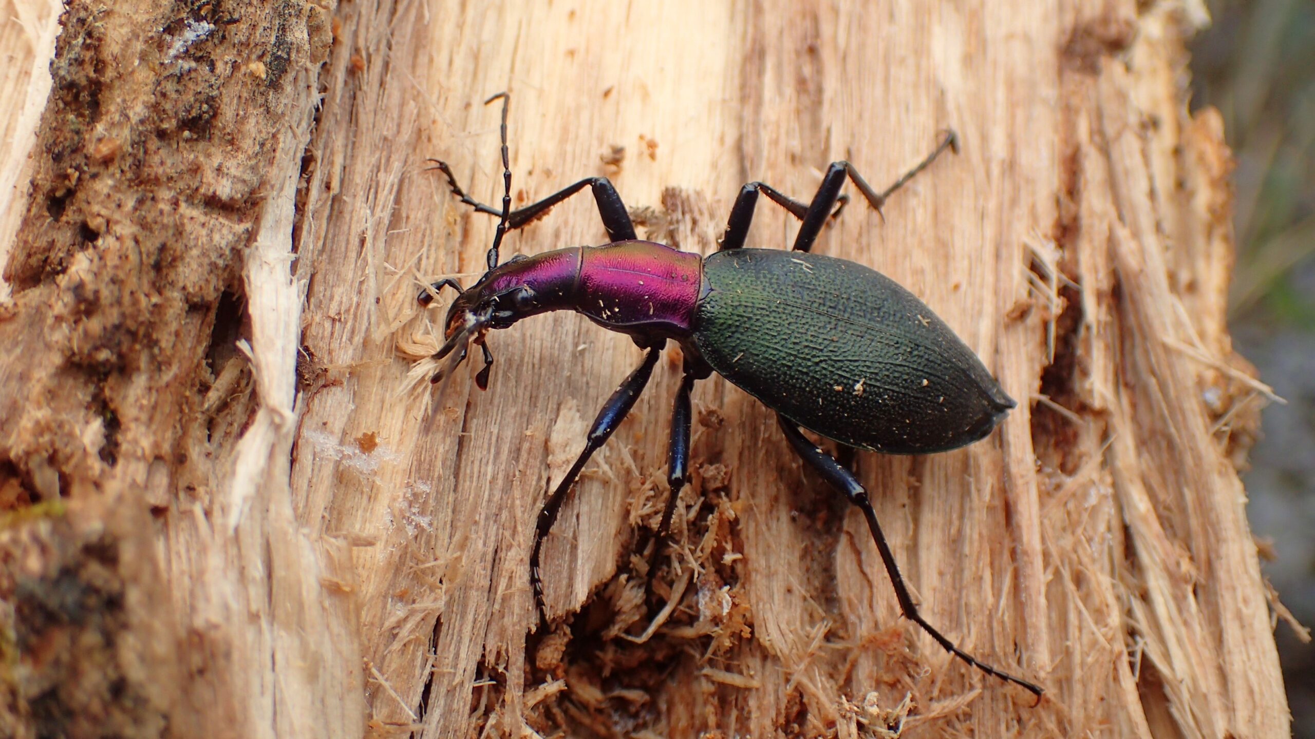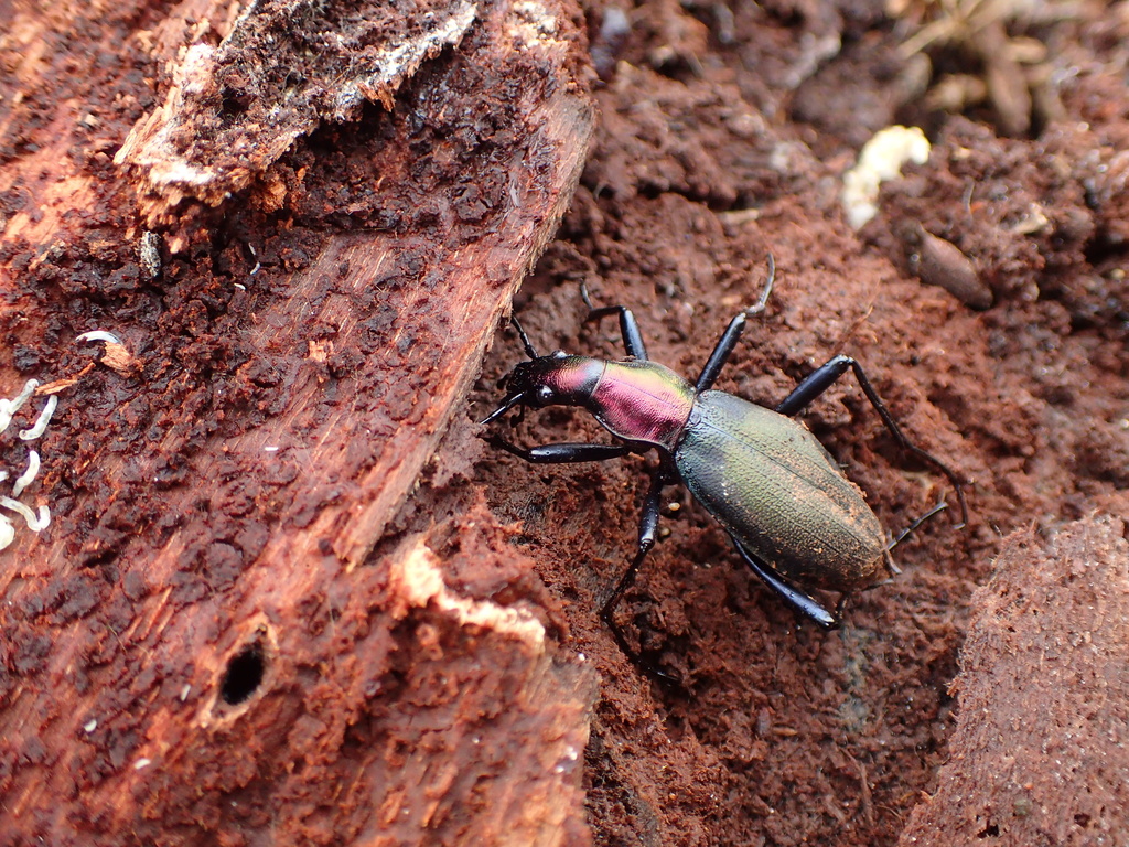 朽木崩しを続けていると、小さめのオサムシが転がり落ちてきました。