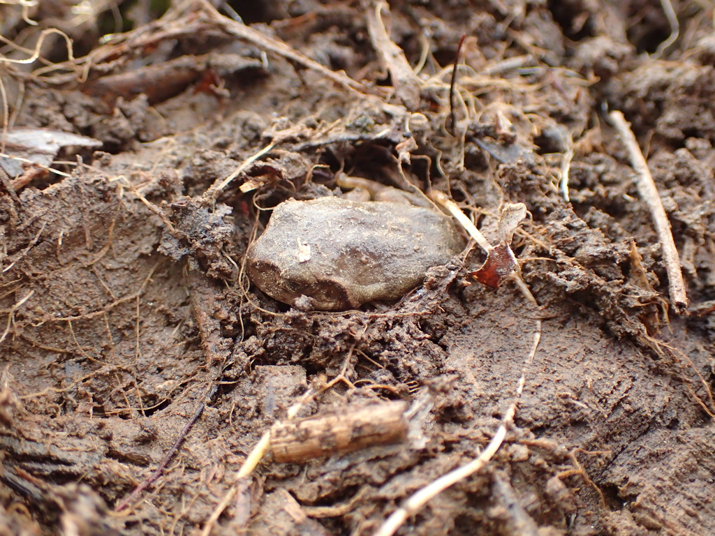 こういう所からはアオオサムシが出るよね、と思いつつ土をどけていくと……思った通り出てきました。