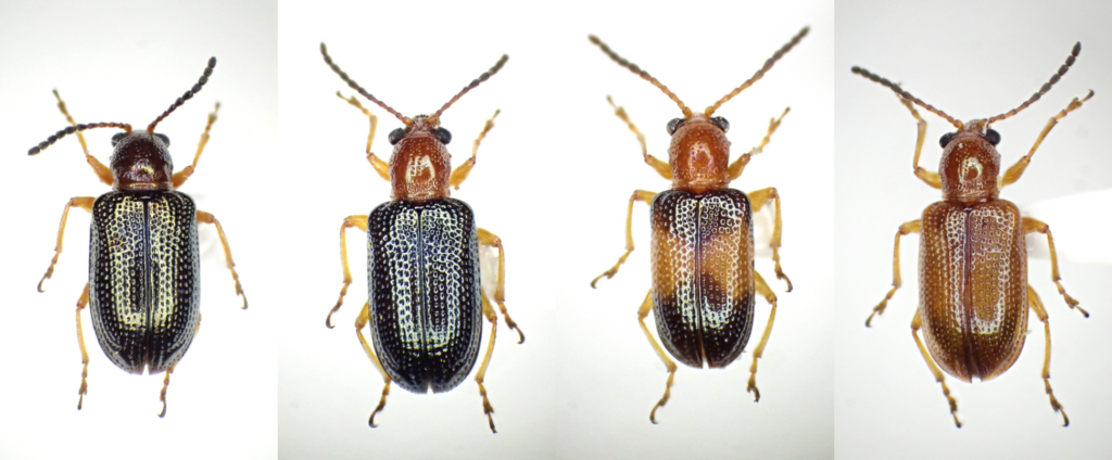 右から2番目の色彩型にならって「アカエリクビボソハムシ」という和名が提唱されました。