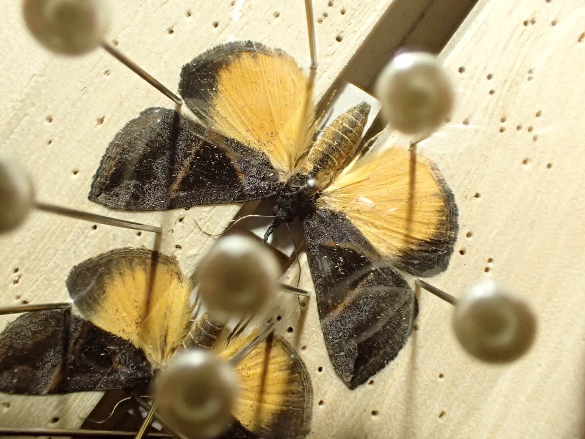 夕方になり、そろそろ帰ろうかと来た道を引き返していたところ……林縁を飛ぶ下翅が黄色い蛾を見つけました。