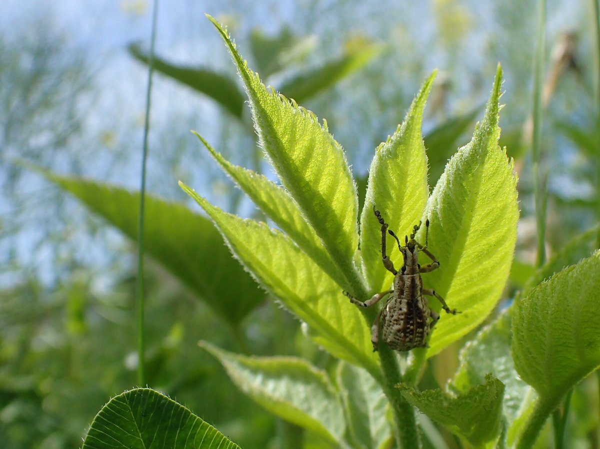 さらに近くにあったウドの葉裏には初めて見るヒメシロコブゾウムシが。