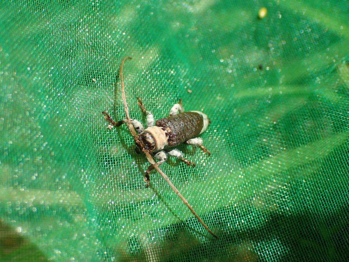 普段やってるような葉っぱのスウィーピングで見かけることは基本的に多くはありませんが、枯れた植物のツルをたたいていると結構な頻度で落ちてくるのがこの虫、ヒシカミキリです。