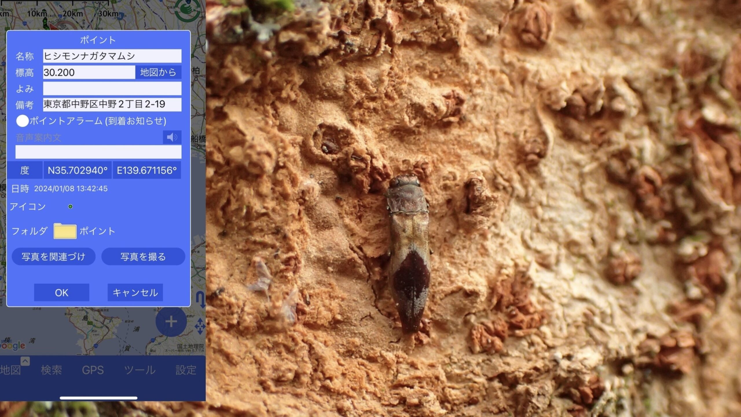 私のポイントデータは最終的にデータベースの作成→ラベル作成にそのまま使うので、たとえ座標がとれなくても全ての採集品について種名・個体数と日時・場所が結びついたデータをアプリ上に記録しておきます。
