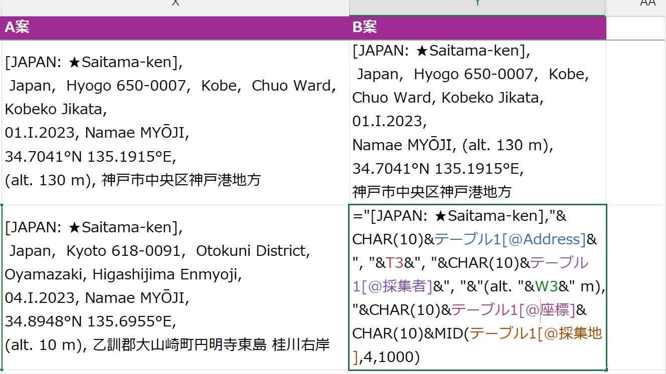 =”[JAPAN: ★Saitama-ken],”&CHAR(10)&テーブル1[@Address]&”, “&T2&”, “&CHAR(10)&テーブル1[@採集者]&”, “&”(alt. “&W2&” m),”&CHAR(10)&テーブル1[@座標]&CHAR(10)&MID(テーブル1[@採集地],4,1000)