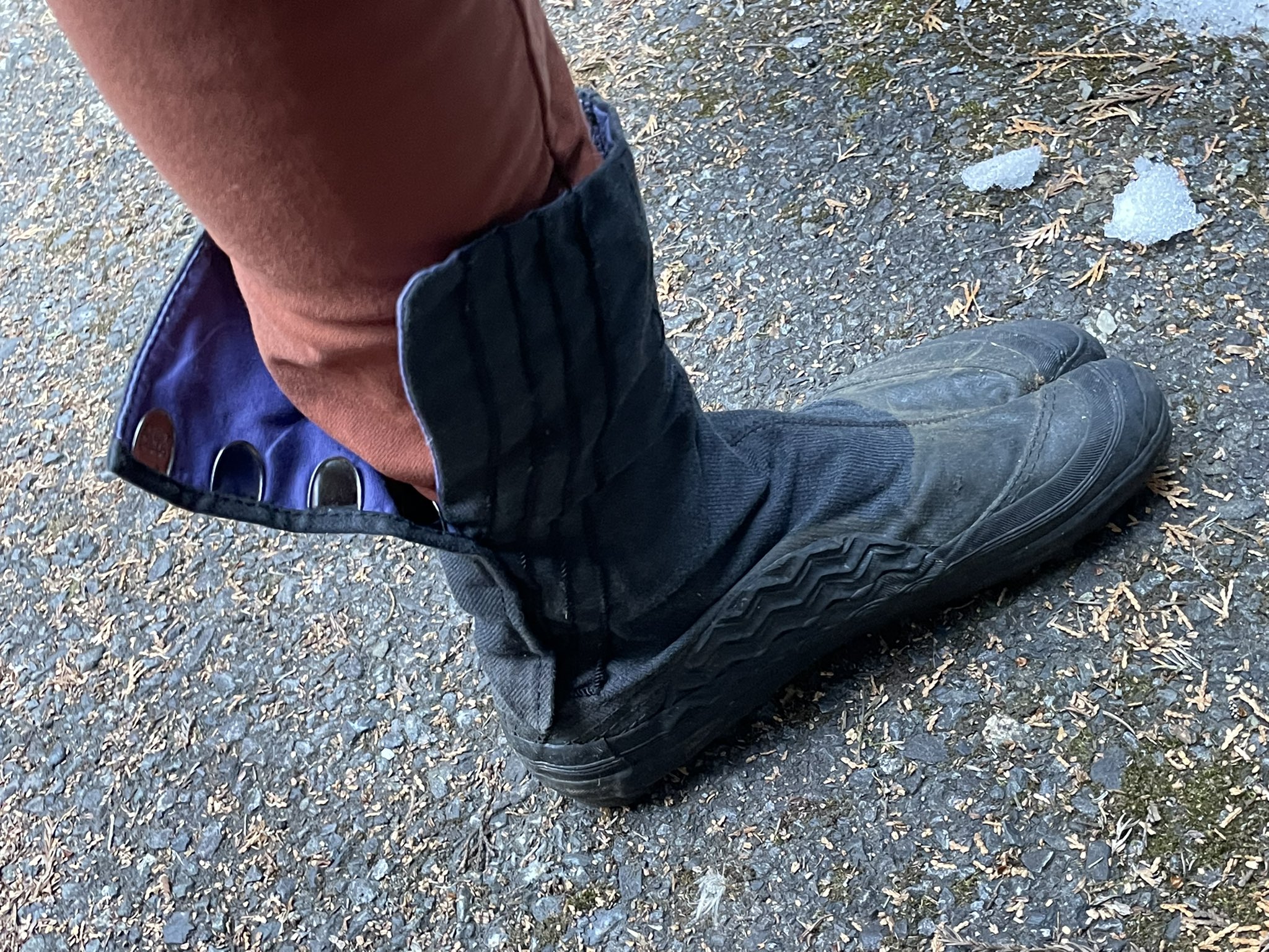 今回は忘れずに持ってきた、スパイク付き地下足袋。