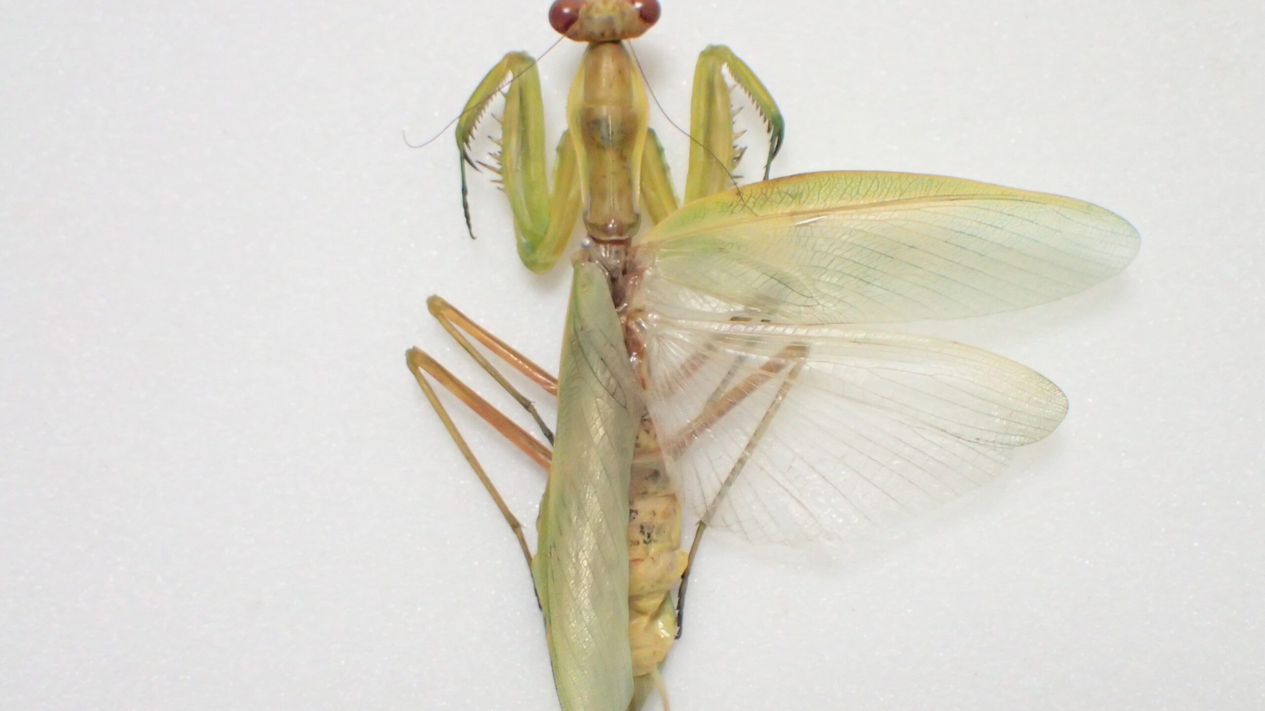カマキリにはバッタの仲間のように体節の間から内臓を抜けるポイントがなく、お腹を縦に切ってそこから内臓を抜き取るのが基本です。