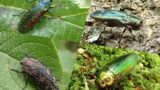 フキの葉上で採れたツヤナガタマムシ、ツヤケシナガタマムシ。