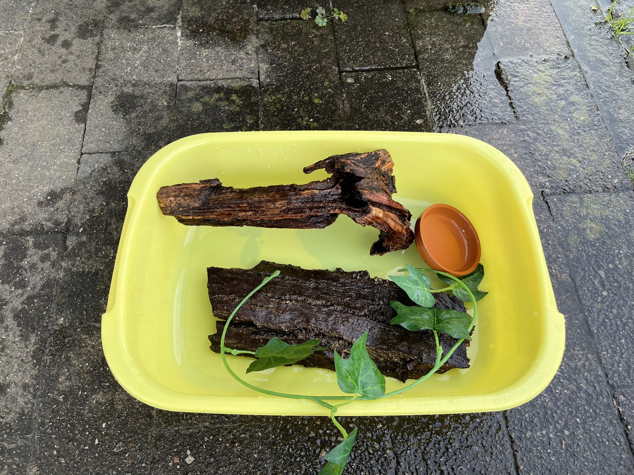 初期から入れている朽木と樹皮は維持。2頭とも樹皮裏がお好きなようで大抵その裏にいますが、たまに保温球の下に温まりに来ています。