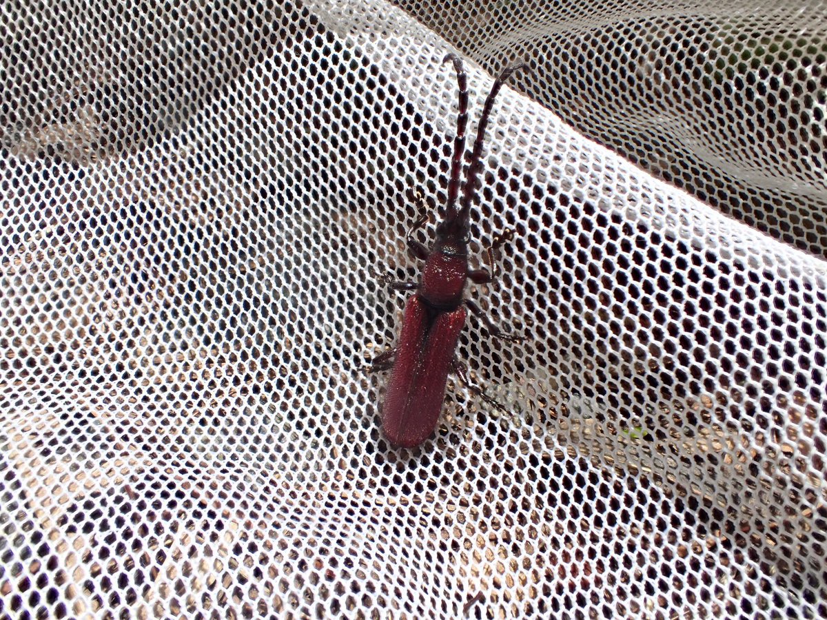 スウィーピング中に飛来した赤い物体をネットインしたら、初採集のクスベニカミキリでした。