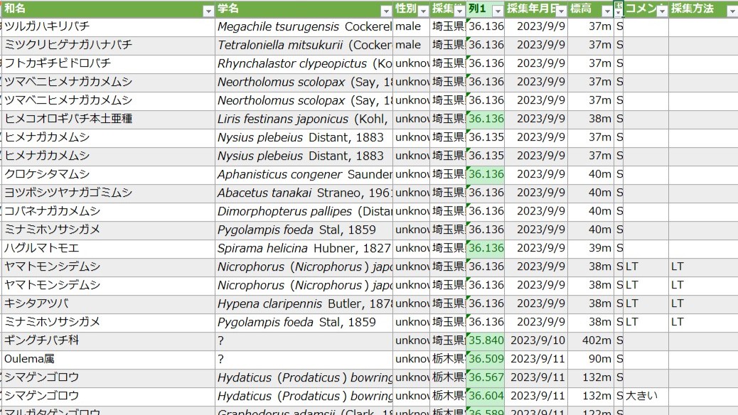 そんな感じで、採集地名の補完作業を終えると、以下のようなデータができます。