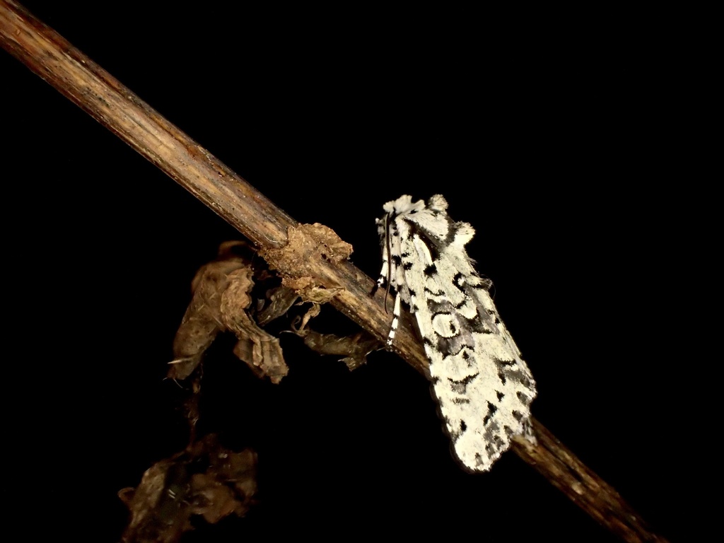 大型で、墨のような黒色の翅を持つキリガです。対照的に下翅はかなり白っぽいです。