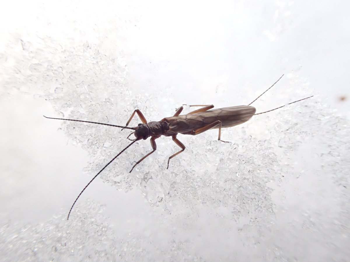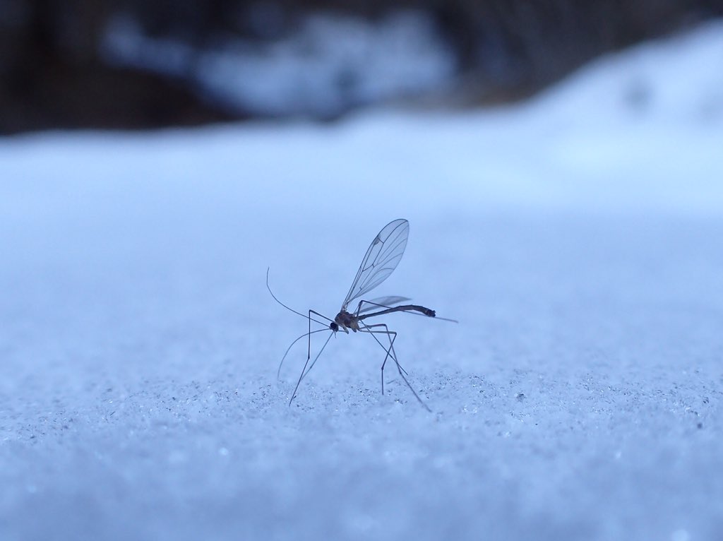 雪の上に仰向けになって亡くなっているその虫はユスリカというには脚が長い。