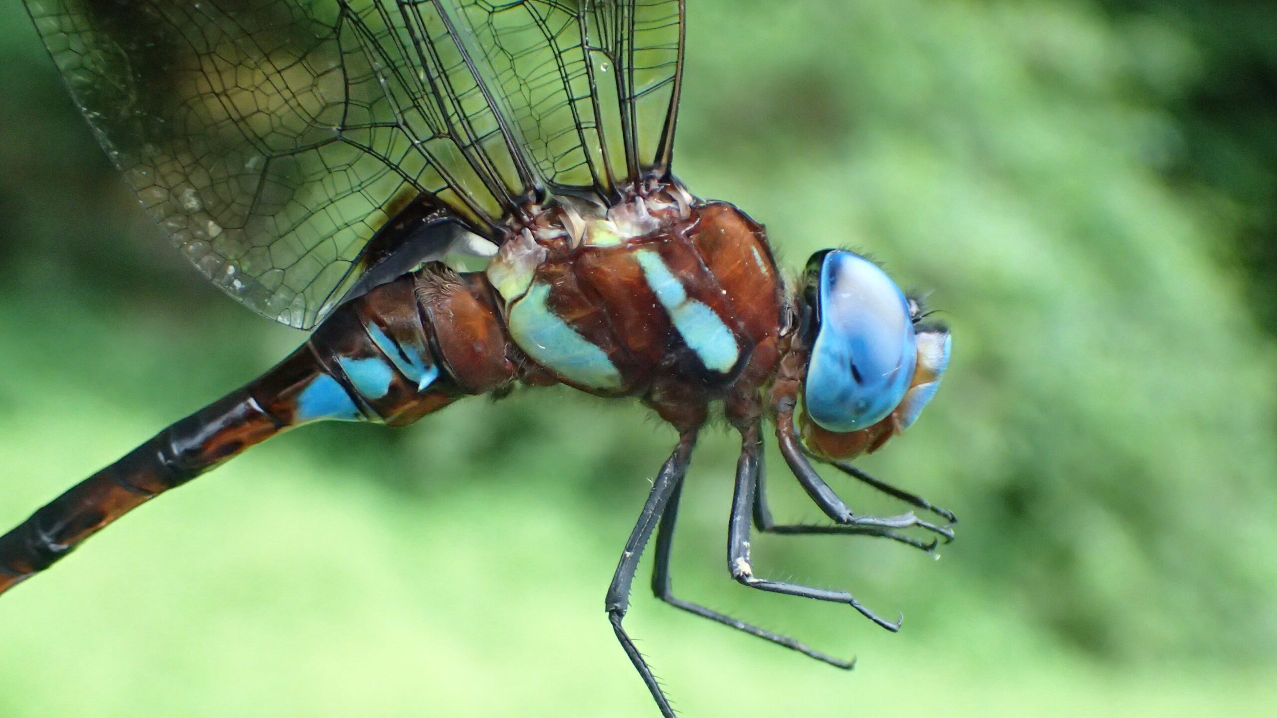 コバルトブルーの体色と複眼は、図鑑や写真で見てきたものよりずっと美しく感じられます。